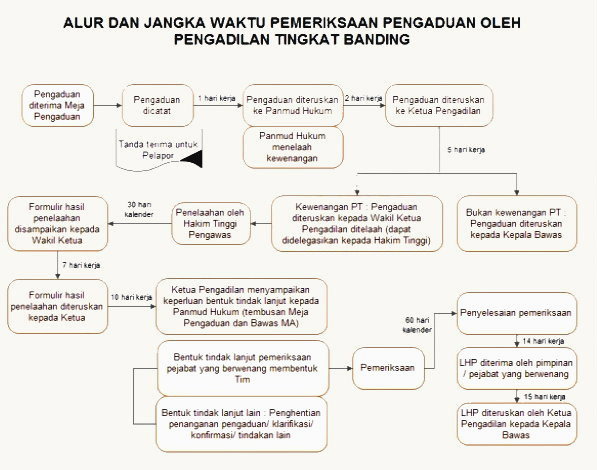 Pengadilan Tingkat Pertama diberikan kewenangan sebatas menerima pengaduan dan berkewajiban untuk meneruskan pengaduan tersebut kepada Pengadilan Tingkat Banding atau Mahkamah Agung dalam jangka waktu 7 (tujuh) hari kerja sejak pengaduan diterima.